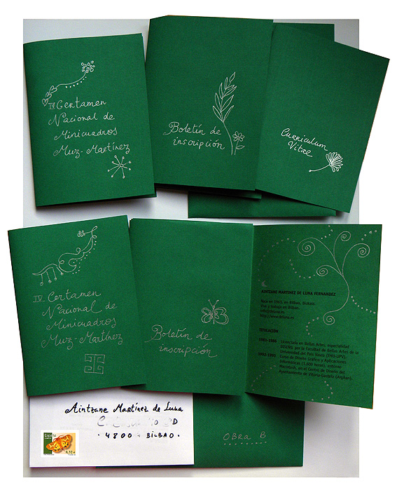 En esta ocasión os muestro la papelería que he acompañado a las obras, casi siempre hay que adjuntar el consabido sobre cerrado incluyendo un breve currículum y un boletín de inscripción. Como he participado con dos cuadros me he “tomado la molestia” de preparar los sobres y CV con diseños diferentes. He utilizado papel y sobres en acabado verjurado, color verde, impresos en una Xerox láser. Parte de la tipografía está escrita a mano, asimismo las ilustraciones también están realizadas a mano y personalizadas. Para que destaque del fondo verde botella he usado rotuladores de tinta plateada.