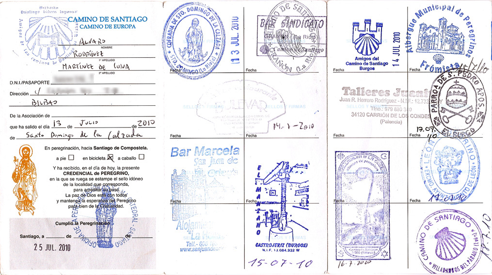 Credenciales del peregrino. Camino de Santiago. Julio 2010.