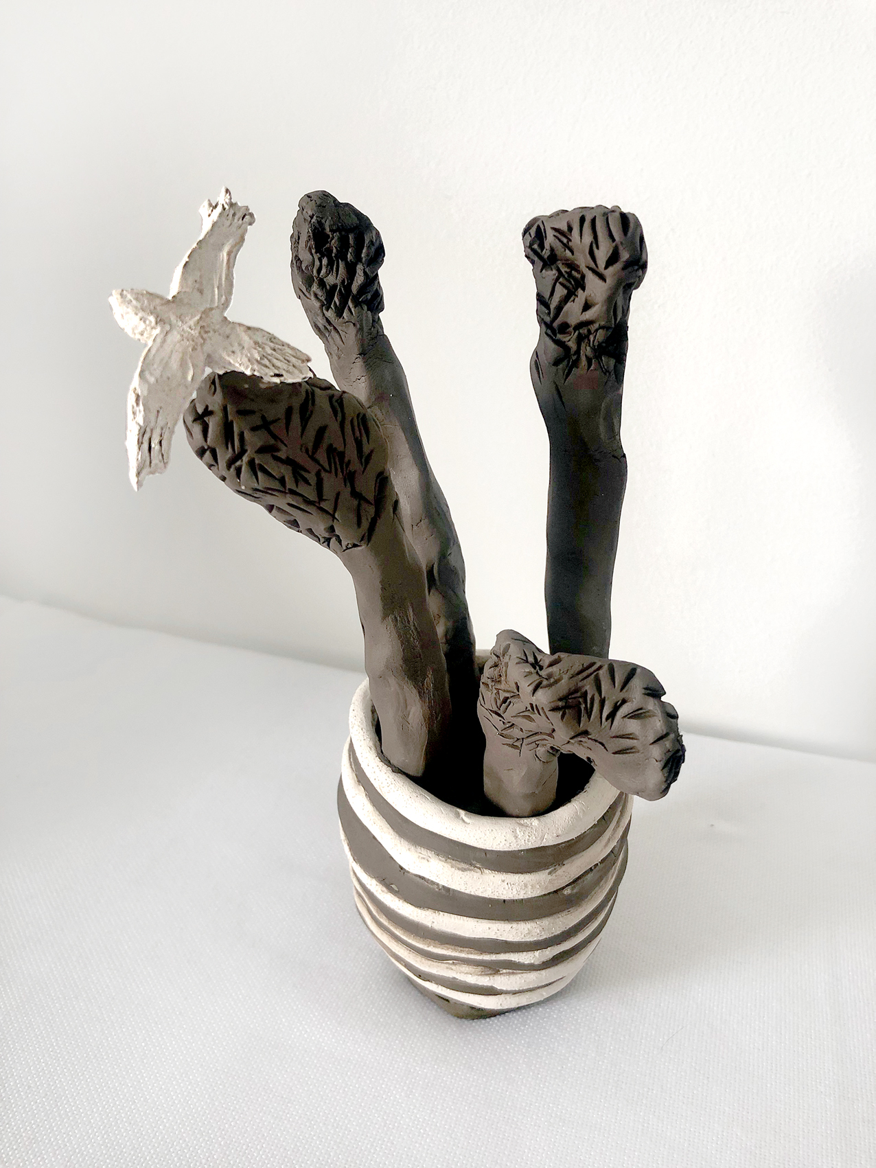 Esta ha sido mi interpretación del collage, mezclando barros de dos colores diferentes: contrastes, claroscuros, tierra y aire, flora y fauna, pasado y presente; el resultado, una pieza primitiva, tribal que enfatiza la importancia de este material desde el punto de vista arqueológico (la invención de la cerámica se produjo durante el neolítico). Tres elementos unidos al hombre desde la antigüedad y que peligran en nuestro ecosistema actual…