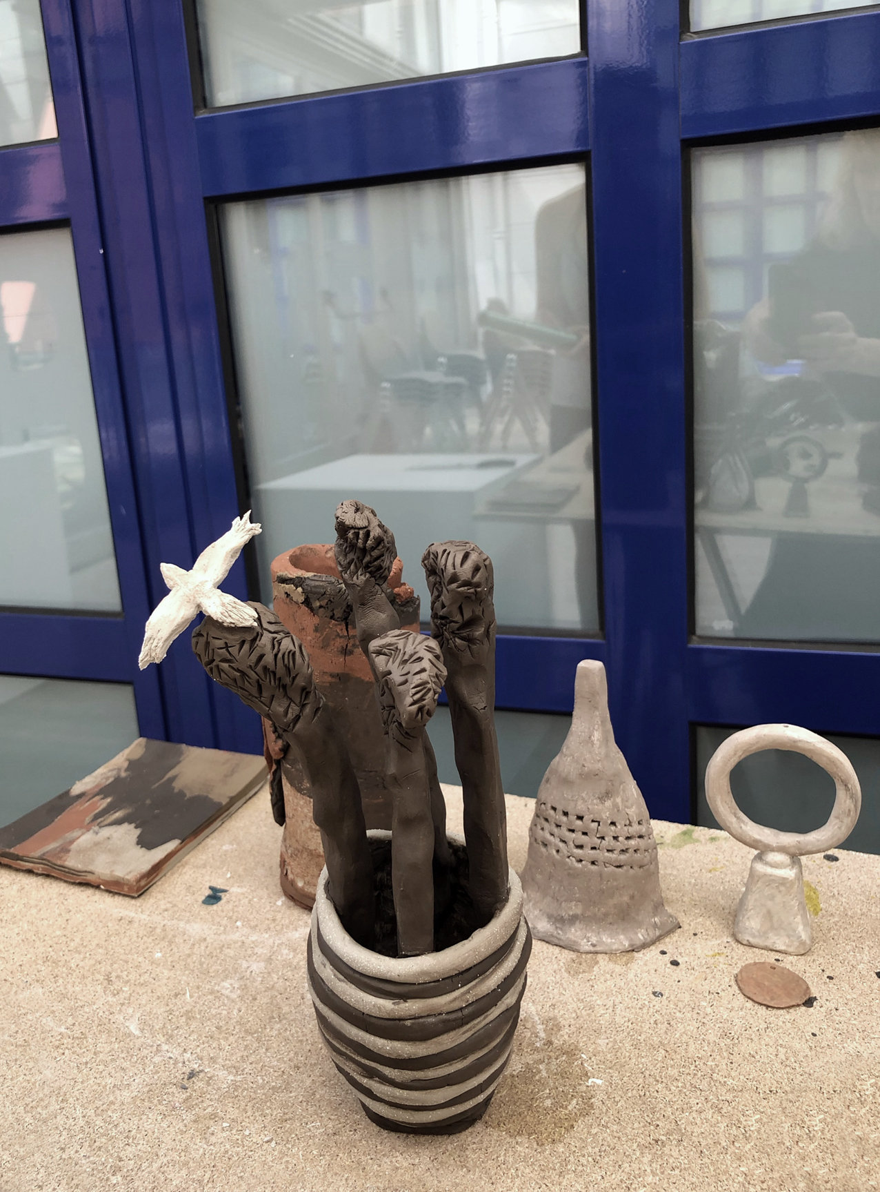 TALISMÁN EXQUISITO. ¿Cómo podemos materializar la abstracción de nuestros rincones misteriosos? El barro es un poderoso material capaz de captar cualquier intención para convertirla en algo eterno. En este taller trabajamos sobre la idea de los amuletos y esculturas rituales que transitan entre este mundo y el otro. Indagamos en nuestras propias formas imaginarias en busca de simbologías personales. A través del collage, jugamos ¿al azar? con imágenes que pudiesen ayudarnos a construir en cerámica un objeto en el que poder volcar parte de nuestra esencia, un talismán exquisito.