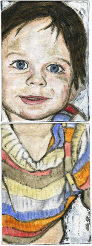 Este trabajo realizado hace unos años fue el punto de partida de la serie trípticos que presento en la exposición. Una colección de retratos de personas de mi entorno y personajes, que como he explicado en alguna ocasión, me interesan por algún motivo. Los trípticos se componen de tres lienzos de diferentes tamaños representando en cada uno, la cabeza, el tronco y las extremidades respectivamente del retratado. En los retratos exploro el lenguaje del gesto, la apariencia superficial, experimento con diferentes clases de perspectivas y relaciono al retratado con un objeto concreto.